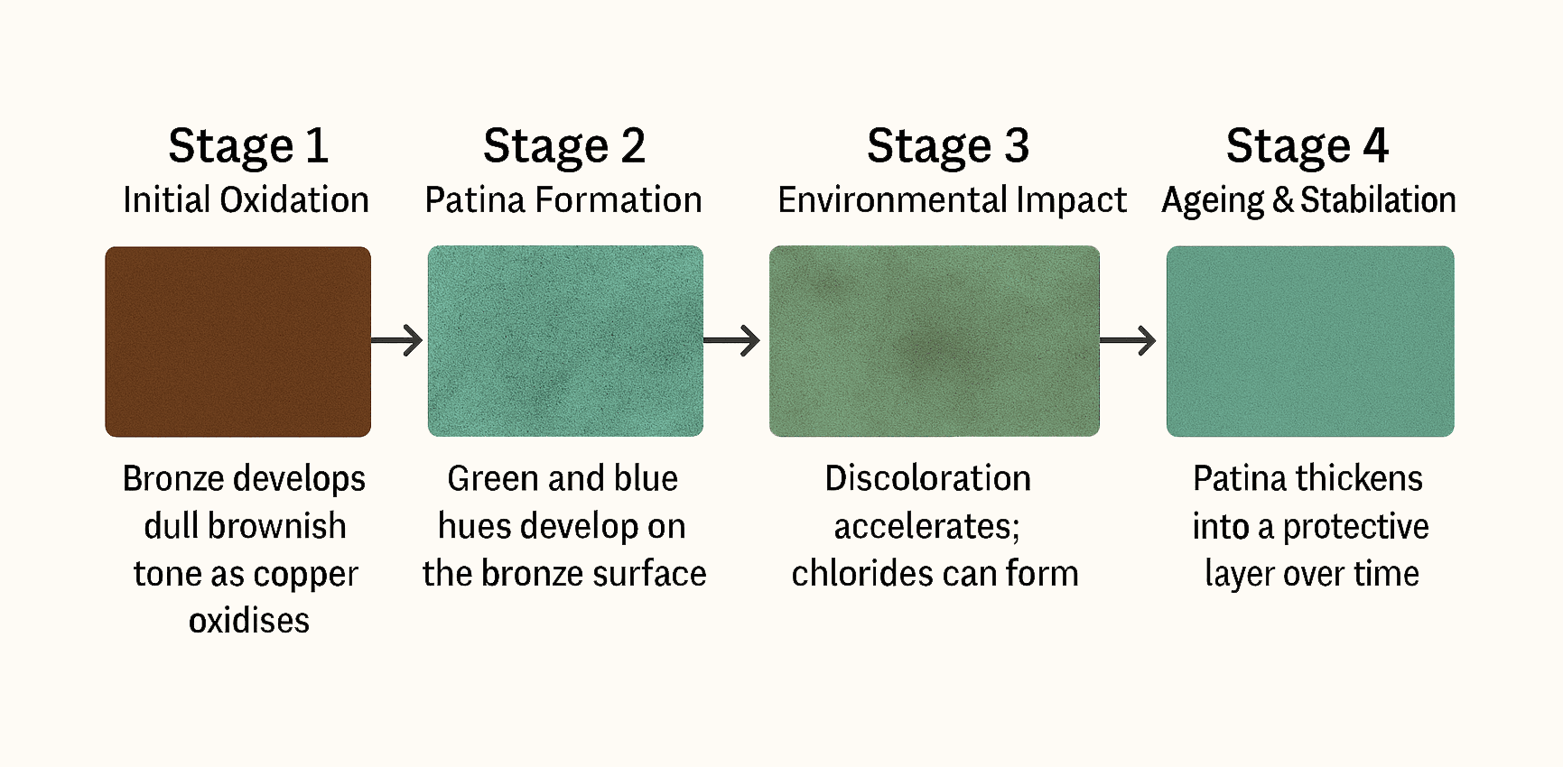 Bronze discolouration occurs primarily due to oxidation, a process called patina formation, and environmental exposure. These changes are normal and often valued for their unique beauty.