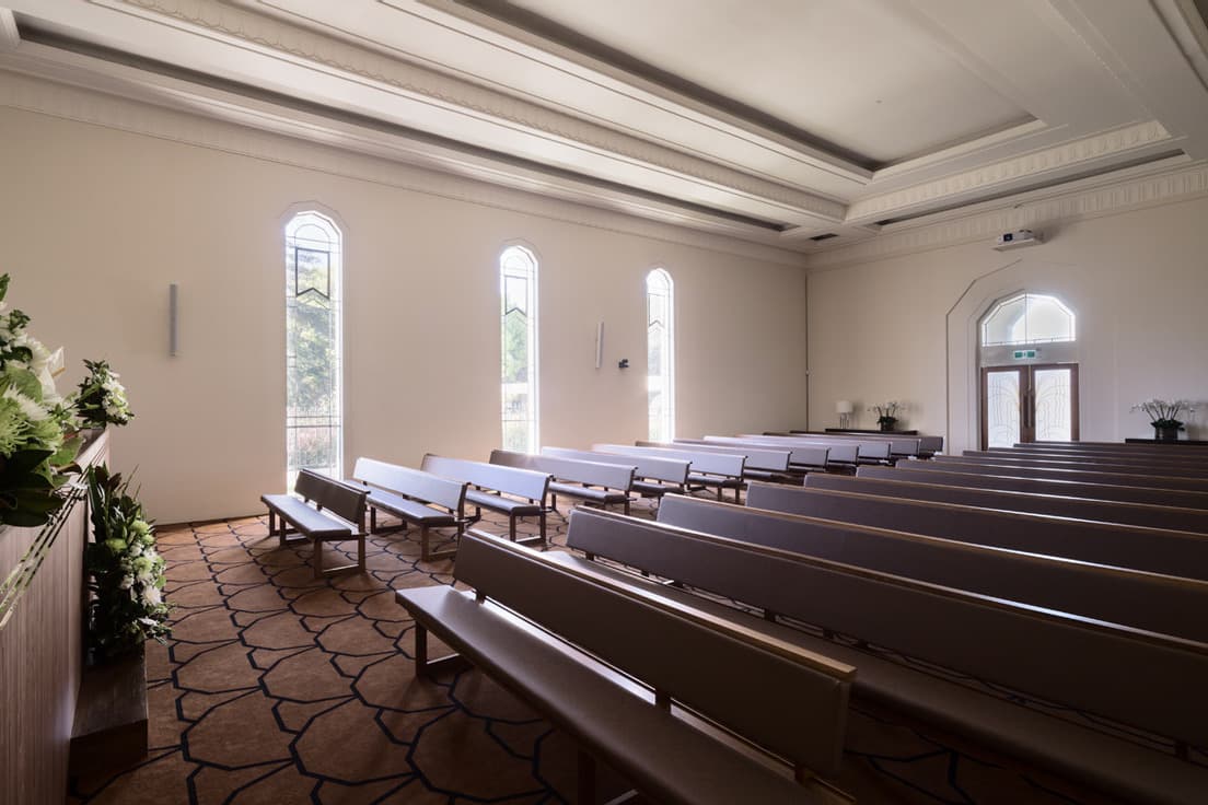 Boyd Chapel is our largest venue - a beautiful, traditional-style chapel featuring high ceilings, arched windows, and dark wood pews. It offers seating for up to 192 guests and is equipped with state-of-the-art multimedia facilities, including live streaming, to support inclusive and meaningful funeral services.