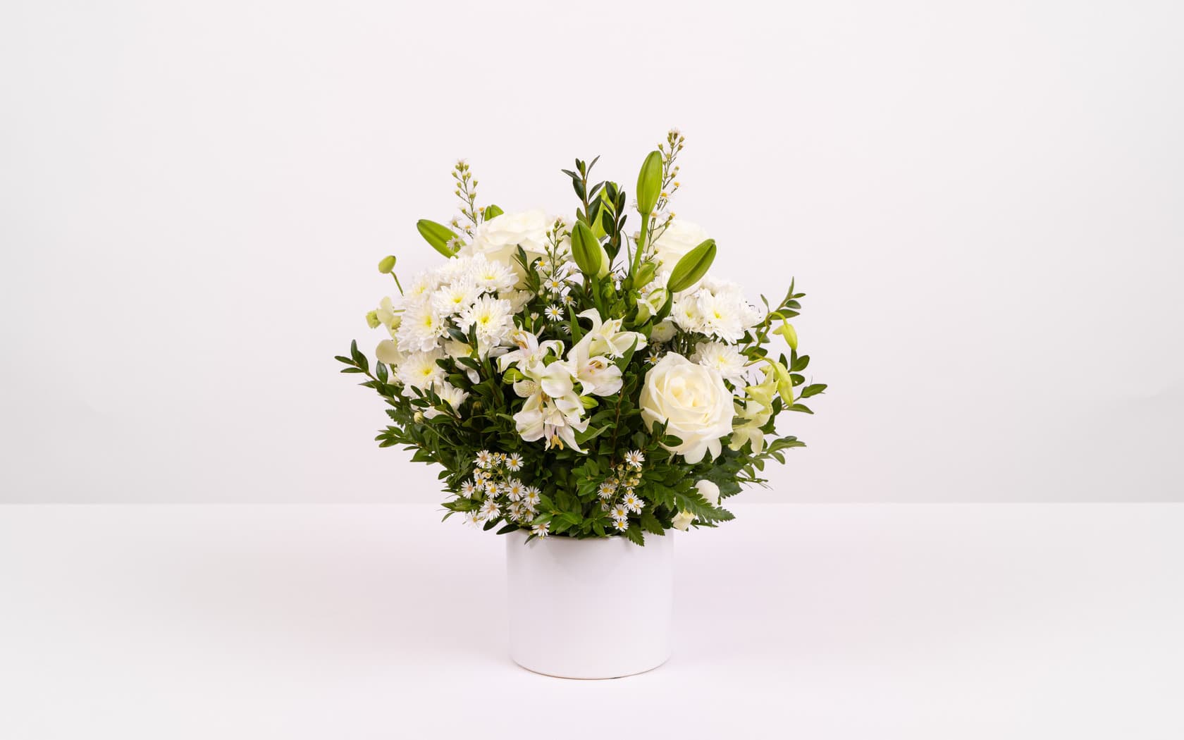 An arrangement in a ceramic vase for a gift or to display at graveside, featuring white flowers such as roses, orchids and lillies. An arrangement in a vase is a perfect floral tribute either for a funeral or a memorial service, or to give as a gift in sympathy. This small vase arrangement is made up of white flowers that convey sympathy, innocence and elegance.