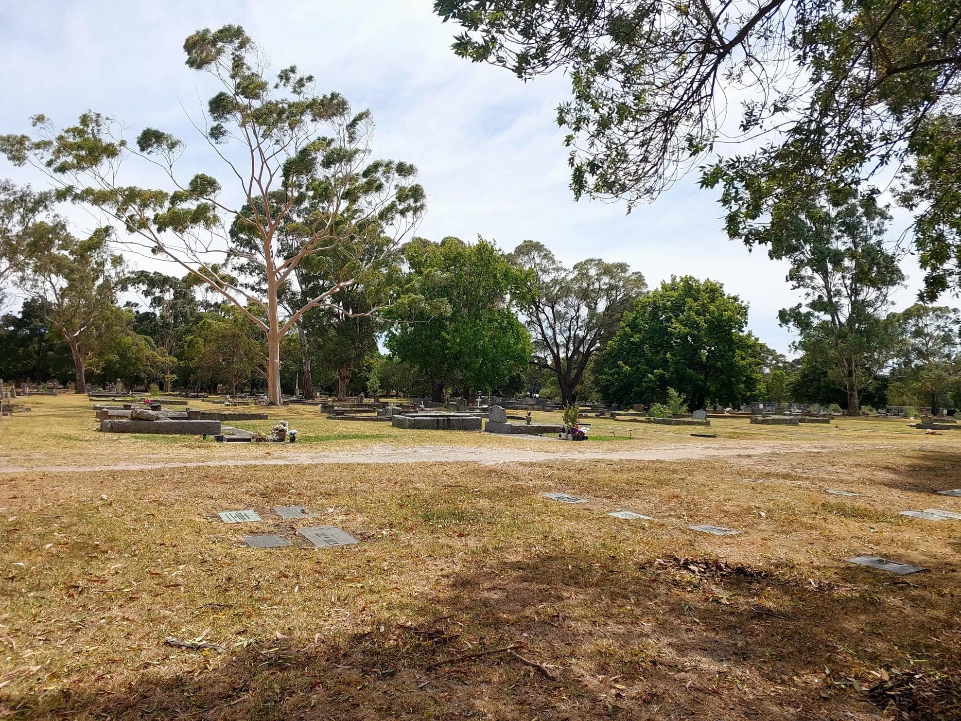 This area features rows of traditional headstones and offers views of the Dandenong Ranges, a creek, a windmill, and various birdlife.