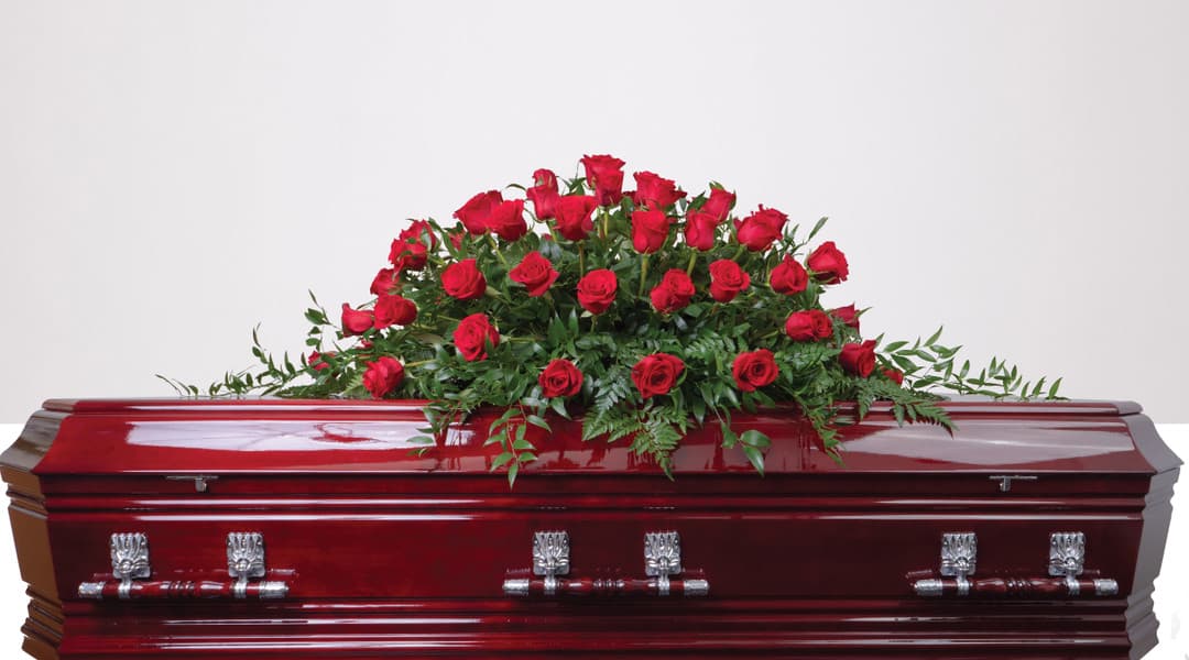 A 1.70m arrangement for decorating a casket or coffin at a funeral, featuring premium roses. Casket sprays are a beautiful way to honour a loved one's life by ensuring that their casket is decorated with flowers during their funeral service. This casket spray of spectacular premium red roses convey love, courage and strength.