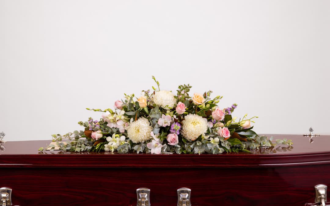 An 80cm arrangement for decorating a casket or coffin at a funeral, featuring disbud, roses and orchids. Casket sprays are a beautiful way to honour a loved one's life by ensuring that their casket is decorated with flowers during their funeral service. This casket spray offers an eye-catching display of soft pastel flowers that conveys affection, harmony and grace.