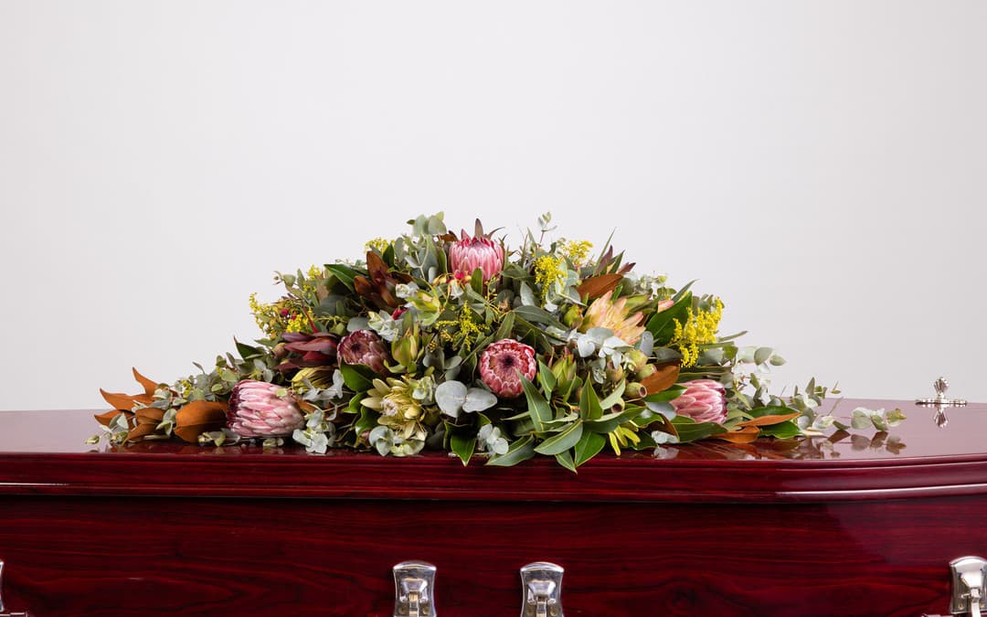 An 80cm arrangement for decorating a casket or coffin at a funeral, featuring native flowers such as protea, leaucadendron, wattle and billy button. Casket sprays are a beautiful way to honour a loved one's life by ensuring that their casket is decorated with flowers during their funeral service. This casket spray is a beautiful vision of seasonal native flowers, perfect for those with a love for Australian plants and landscapes.