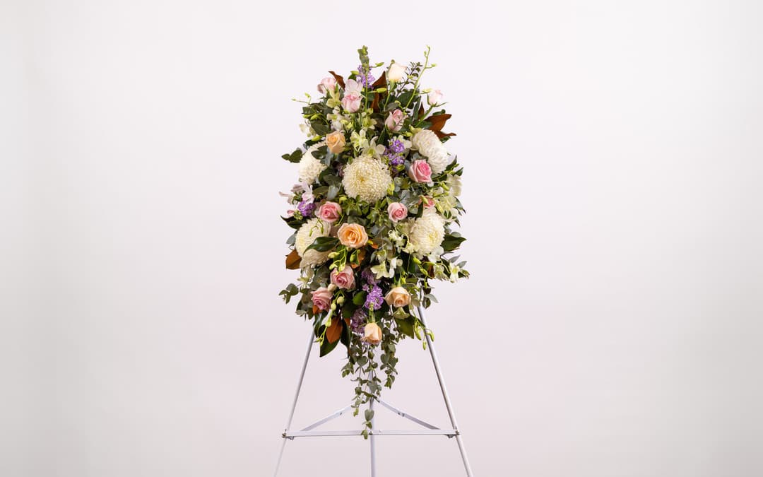 An arrangement for display at a funeral, featuring pastel flowers such as disbud, roses and orchids. Standing sprays make an impressive statement of love and respect when displayed as part of a funeral or memorial service. This standing spray of gorgeous pastel flowers provides a spot of gentle brightness and conveys warmth, affection and harmony.