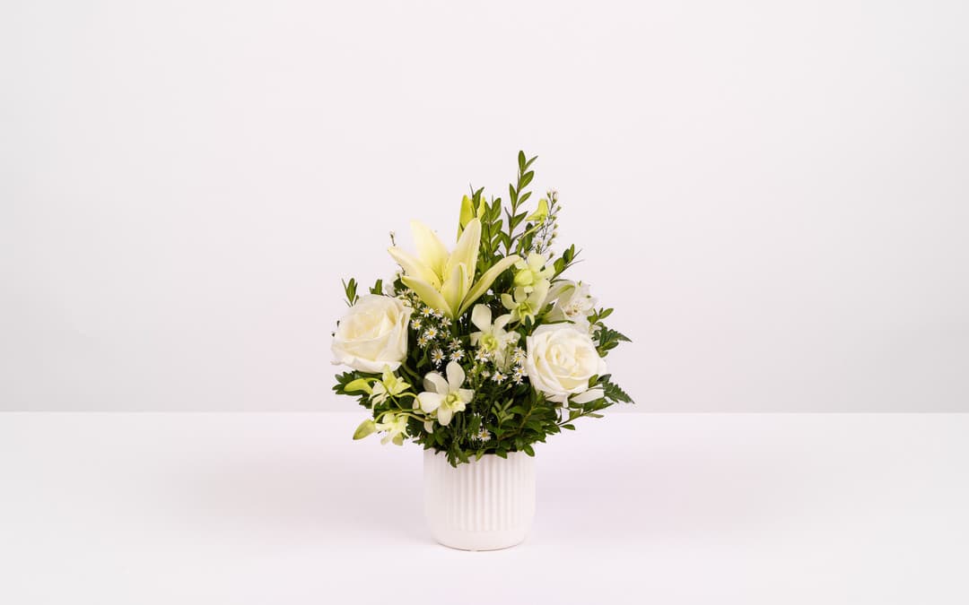 An arrangement in a ceramic vase for a gift or to display at graveside, featuring white flowers such as roses, orchids and lillies. An arrangement in a vase is a perfect floral tribute either for a funeral or a memorial service, or to give as a gift in sympathy. This extra small vase arrangement is made up of white flowers that convey sympathy, innocence and elegance.