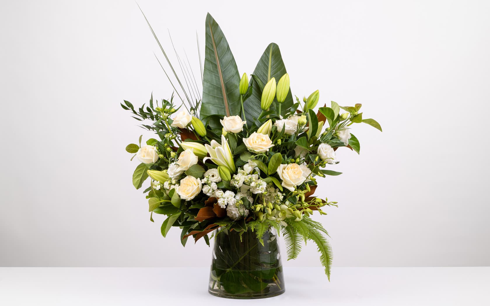 An arrangement in a glass vase featuring white flowers such as roses, Oriental lily, lisianthus, stock and freesia. An arrangement in a vase is a perfect floral tribute either for a funeral or a memorial service, or to give as a gift in sympathy. This premium vase arrangement is made up of white flowers that convey sympathy, innocence and elegance.