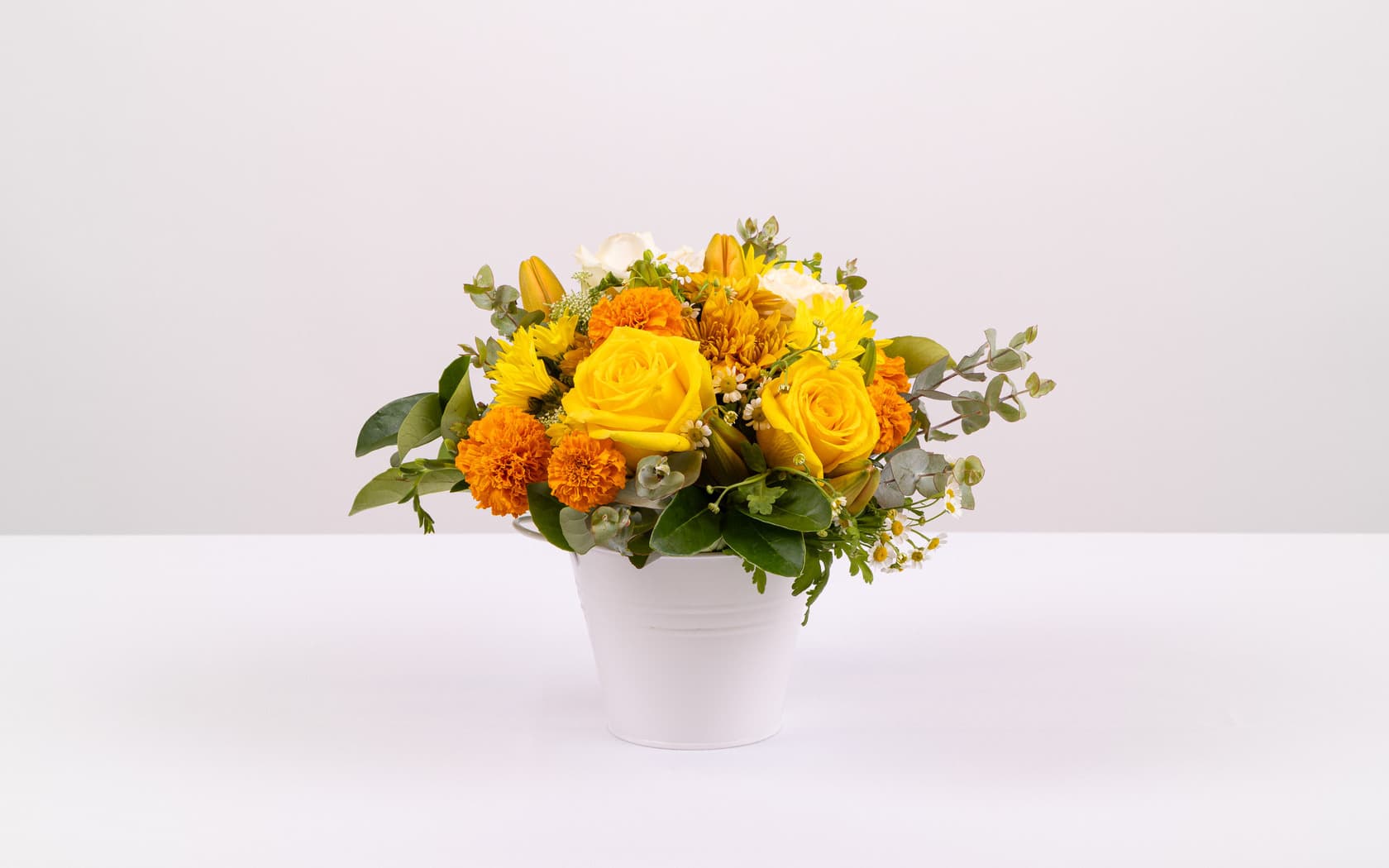 An arrangement in a metal pail for a gift or to display at graveside, featuring roses and lillies. A posy pail is cute floral arrangement that is presented in a hardy metal vase that is perfect as a gift or as a tribute to display at a gravesite or memorial. This standard posy pail is comprised of a mix of brightly coloured flowers, conveying warmth and affection.