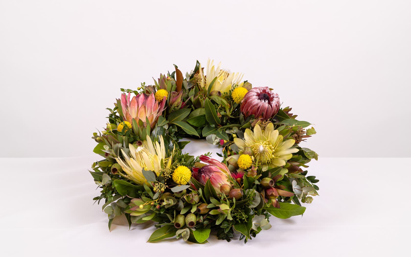 A wreath arrangement for displaying at a funeral, featuring native flowers such as protea, leaucadendron, wattle and billy button. A wreath is a traditional floral token of respect for a funeral or memorial service. This wreath is made up of beautiful seasonal native flowers and greenery which is perfect for those with a love for Australian plants and landscapes.