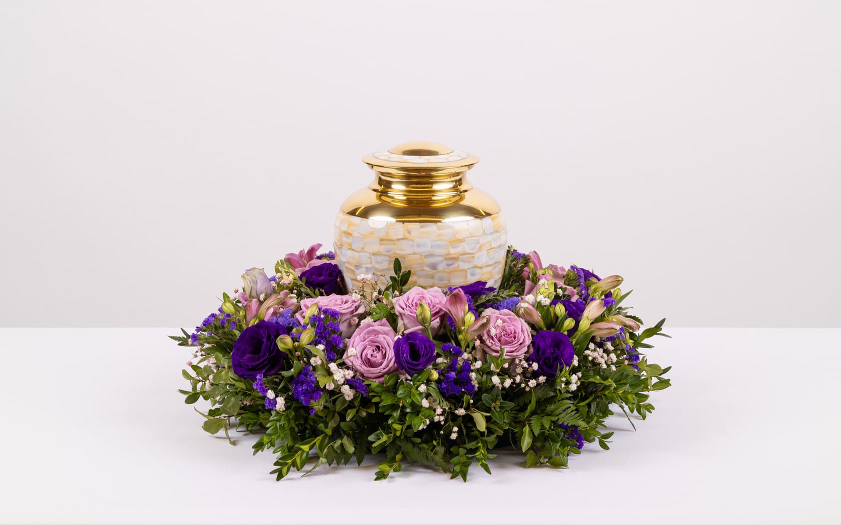 A wreath arrangement for displaying with an urn, featuring roses, lisianthus, alstromeria and baby's breath. Displaying an urn surrounded by a wreath of beautiful blooms can be a touching addition for a memorial service. This urn spray wreath is comprised of an arrangement of brightly coloured flowers that provide warmth and beauty.